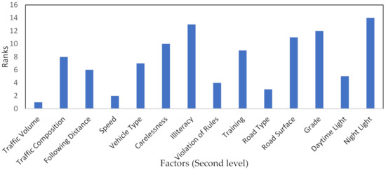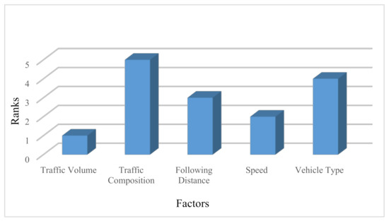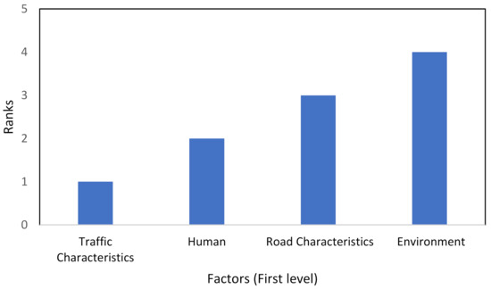 The AHP–BWM model was adopted based on the number of factors in each cluster to estimate factors significance affecting frequent lane-changing based on drivers’ responses. The total number of evaluated comparisons for the conventional AHP was 20 (12 comparisons for 2 (4 × 4) matrices + 5 comparisons for 5 (2 × 2) matrices + 3 comparisons for one (3 × 3) matrix), and 7 comparisons were evaluated for the BWM. Following that, the total number of the evaluated comparisons for the proposed model was 27 comparisons. However, if the conventional AHP was applied for all structures, the evaluator needed to evaluate 30 comparisons. The results were achieved based on the following steps: