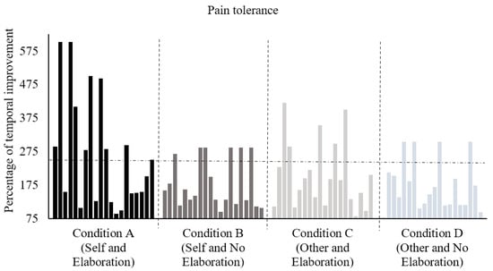 Percentage of temporal improvement in pain tolerance in posttest in relation to pretest for participants of each experimental condition. The horizontal, dashed line highlights improvements above 250% of temporal improvement.