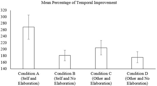 Mean percentage of temporal improvement in posttest in relation to pretest for each experimental condition and error bars.