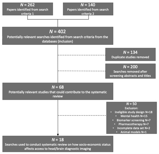 The first stage of selection included screening the titles and abstracts of articles to decide if the articles could be a relevant contribution to the research using the inclusion and exclusion criteria detailed in Table 2. Following this, the remaining studies were read and screened for any relevant data and findings on inequalities in access to diagnostic neuroimaging. While imaging type is important to the finding of this research, if it was not directly mentioned or measured, papers that reported other measures of disease progression and potential disparities with relevant findings were still included. This inclusion and exclusion criteria were based on the NICE guidelines for dementia, as it is assumed that data on diagnosis of these diseases would not be available without the use of diagnostic imaging [30].
