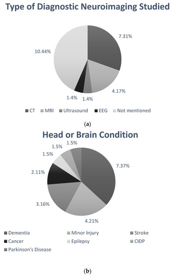 Eighteen papers were eligible for this systematic review. Their study characteristics and conclusions are detailed in Table 5. Figure 2a highlights the number of papers discussing each type of imaging. Approximately 31% of the studies discuss the use of CT. Figure 2b shows the distribution of studies included on each neurological condition. Approximately 38% of the studies (7/18) focused on the prevalence of dementia, while only one study discusses epilepsy.