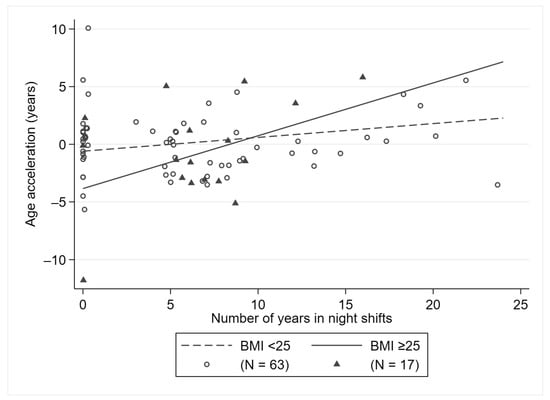 Association between the number of years in night shifts and age acceleration, stratified by BMI.