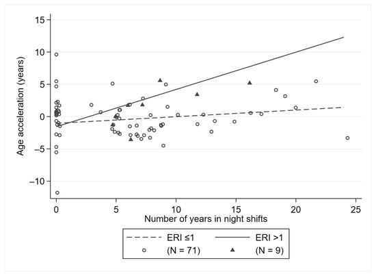 Association between the number of years in night shifts and age acceleration, stratified by ERI.
