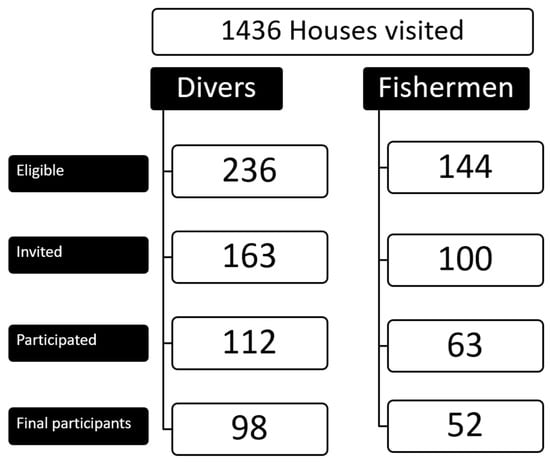 In total, we visited 1436 households. A total of 236 divers and 144 fishermen fulfilled the inclusion criteria. We were able to personally invite 163 divers and 100 fishermen, of whom 112 divers (69% response) and 63 fishermen (63% response) participated. Of 166 participants who agreed to perform a spirometry, 150 spirometries met the quality requirements and were used for further analysis (98 from divers and 52 from fishermen, Figure 1). From the 98 divers, 12 were ex-divers (8%) who had stopped diving because of diving accidents (7), other diseases (2), economic reasons (1) or unknown reasons (2). From the 52 fishermen, 7 were ex-fishermen (5%) due to economic (3), health (1) and unknown (3) reasons.