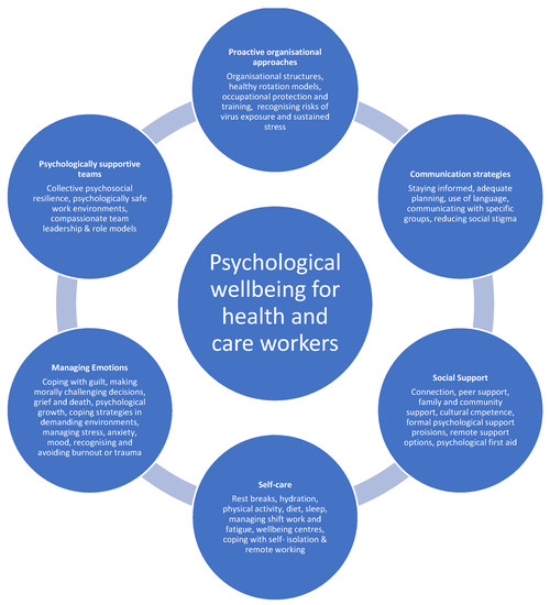 - Blake, H.; Bermingham, F.; Psychological Wellbeing for Healthcare Workers: Mitigating the Impact of COVID‐19. The University of Nottingham 2020, Version 2.0: Last updated 18.06.2020. Available online: https://www.nottingham.ac.uk/toolkits/play_22794 (accessed on 11 October 2021).