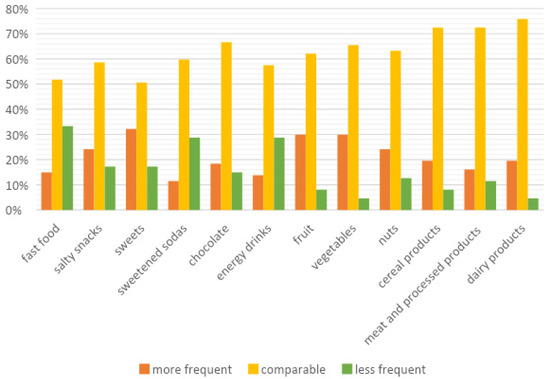 The next part of the research was to evaluate changes in the frequency of consumption of various groups of food products. Most of the respondents declared no changes in the frequency of consumption of selected food products. Interestingly, around 30% of people surveyed said they consumed more fruit and vegetables during the pandemic and, at the same time, consumed less fast food, sweetened soda and energy drinks (Figure 1). Similar conclusions were drawn by Hassen et al., who demonstrated a beneficial change in eating habits during the pandemic. Consumers reduced their consumption of fast food and sweet and salty snacks. At the same time, their supply of water, fruit and vegetables increased [21].