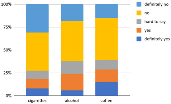 The questionnaire also asked about the impact of the COVID-19 pandemic on changes in the frequency of use of drugs (cigarettes, alcohol and coffee). The vast majority of respondents denied that the COVID-19 pandemic caused an increase in the frequency of drug use (Figure 2).