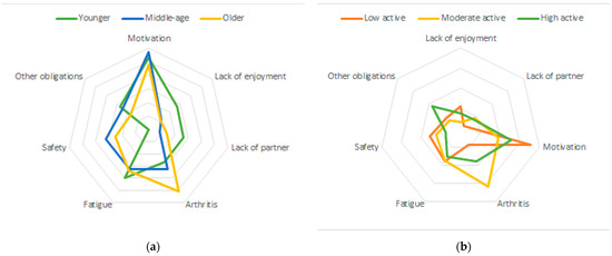 (a) Polar plot of thematic analysis of barriers by age category (younger n = 16; middle aged n = 52; older n = 73). (b) Polar plot of thematic analysis of barriers by physical activity category (low active n = 45, moderate active =57; high active =39).