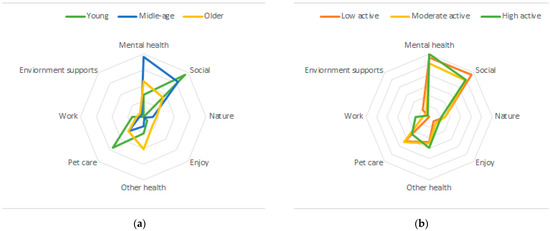 (a) Polar plot of thematic analysis of motivators by age category (younger n = 31; middle age n = 117; older n = 134). (b) Polar plot of thematic analysis of motivators by physical activity category (low active n = 68, moderate active =92; high active =122).