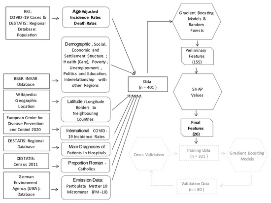The following datasets were derived from sources in the public domain: Robert Koch Institute, ESRI. RKI COVID19. dl-de/by-2-0 (https://npgeo-corona-npgeo-de.hub.arcgis.com/datasets, accessed on 26 January 2021). Statistical Offices of the Federation and the Länder Regional database (https://www.regionalstatistik.de/genesis, accessed on 27 January 2021). DESTATIS Census 2011: Census database (https://ergebnisse.zensus2011.de, accessed on 6 April 2021). INKAR Database: Federal Institute for Research on Building, Urban Affairs, and Spatial Development. INKAR—Indikatoren und Karten zur Raum- und Stadtentwicklung 2020 (https://www.inkar.de/, accessed on 25 November 2020). European Center for Disease Prevention and Control: Download historical data (to 14 December 2020) on the daily number of new reported COVID-19 cases and deaths worldwide (https://www.ecdc.europa.eu/en/publications-data/download-todays-data-geographic-distribution-covid-19-cases-worldwide, accessed on 29 January 2021) The following data are available on request from the data holder: Emission data: German Environment Agency Database (UAB): https://www.umweltbundesamt.de/en (received on 22 May 2019).