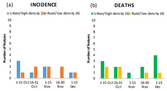 Number of features in the top 20 showing the relationship between urbanity/rurality and density, and incidence (a) and death rates (b) by time period.