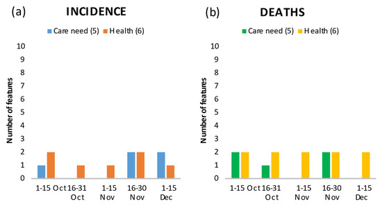 Number of features in the top 20 showing the relationship between care need and health, and incidence (a) and death rates (b) by time period.