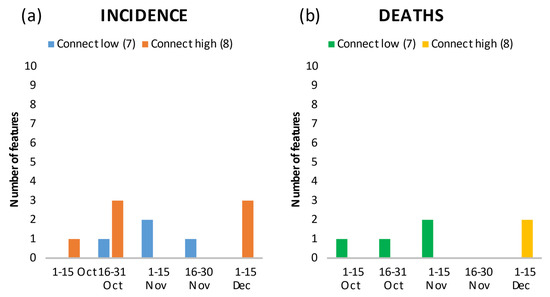 Number of features in the top 20 showing the relationship between connectedness, and incidence (a) and death rates (b) by time period.