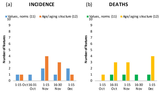 Number of features in the top 20 showing the relationship between values/norms and age/ageing structure, and incidence (a) and death rates (b) by time period.