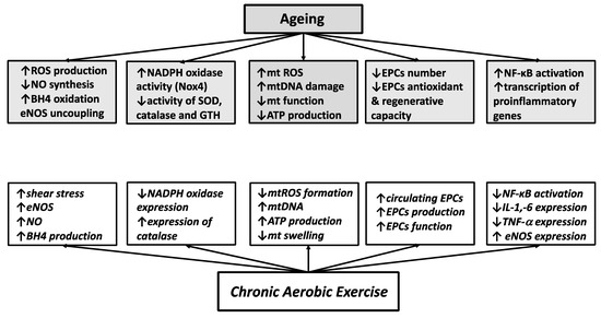 Chronic aerobic exercise is supposed to prevent and/or reverse age-related endothelial dysfunction by increasing NO bioavailability, improving intracellular redox balance and mitochondrial health, increasing number and recovering capability of circulating EPCs and lowering systemic inflammation (Figure 1).