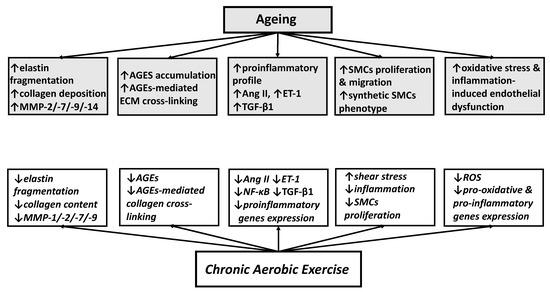 Experimental and human studies identified the mechanisms by which aerobic exercise prevents and/or reverses age-related arterial stiffening. These mechanisms include reduction in MMPs activity and AGEs accumulation, inhibition of SMCs proliferation and migration and decrease in oxidative stress and inflammation (Figure 2).