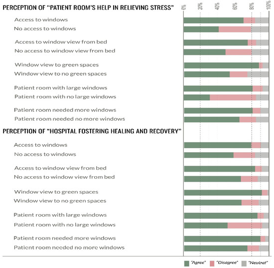 The relationship between window size (large vs. not large) and the perception of the room environment in helping to relieve the patient’s stress was significant (X2 (2, N = 433) = 82.15, p < 0.001), and the effect size was moderate (0.43). A higher percentage of the participants in the patient room with large windows (80%) perceived the room environment to help relieve their stress compared to only 32% of the participants who disagreed that they had large windows in their patient room. The relationship between window size (large vs. not large) and the perception about the hospital care environment fostering their healing and recovery was significant (X2 (2, N = 433) = 48.9, p < 0.001), and the effect size was moderate (0.33). A higher percentage (87%) of the participants who reported having larger windows in their patient rooms perceived the hospital environment to foster their healing and recovery compared to only 52% of the participants who stayed in rooms with no large windows (Figure 2).
