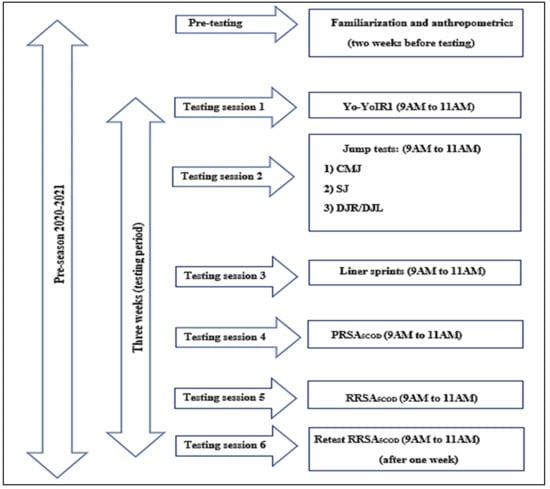 Following pre-testing familiarization and anthropometric measurements which were conducted two weeks before, participants took part in six testing sessions. Sessions one to five were dedicated to testing the determinants of performance in the multidirectional reactive repeated sprint test (RRSA5COD), while the last session was a retest of session five to test the reliability of this test (see Figure 1). The study lasted three weeks and was conducted during the pre-season of the 2020/2021 season.
