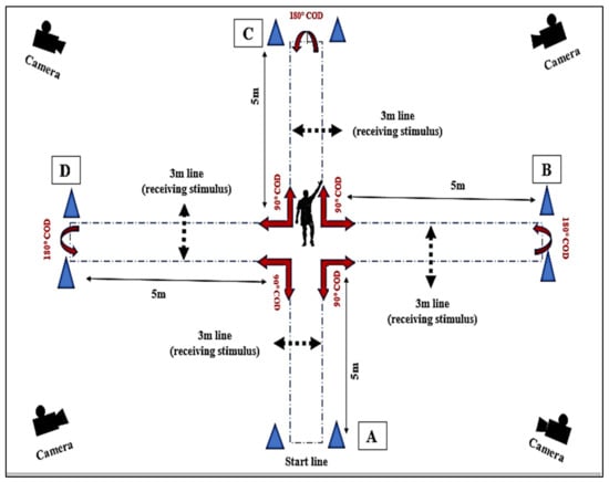 -Example for one repetition: [The participant commenced from the (A: Start line); sprinting 5 m to the center of the cross (in the meantime receiving visual stimulus at 3 m line); performing 90° COD; sprinting 5 m to (line B: performing 180° COD); Sprinting 5 m to the center of the cross (in the meantime receiving visual stimulus at 3 m line); performing 90° COD; sprinting 5 m to (line C: performing 180° COD); Sprinting 5 m (in the meantime receiving visual stimulus at 3 m line); performing 90° COD; sprinting 5 m to (line D: Finish line)].