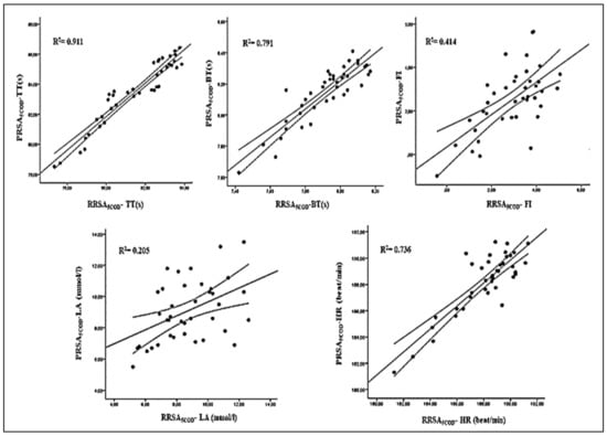 Figure 3 presents the correlations between the RRSA5COD and PRSA5COD tests for each parameter. The results showed that, except for the RPE, all the variable of the two tests were significantly correlated (p < 0.05). (See Figure 3).