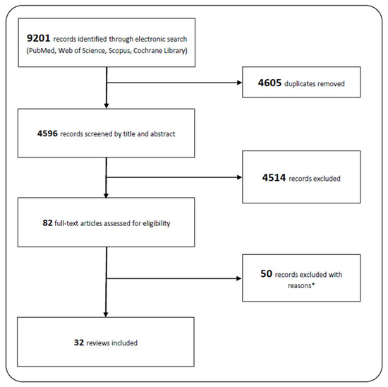 Flow-chart literature search and study selection process * Reasons for exclusion: no systematic review (e.g., conference paper, mini review…; 26), no physical health indicator (4), no PA or SED measure (4), special population (2), wrong age (4), missing information (3), and wrong focus, e.g., comparison of training effects (7).