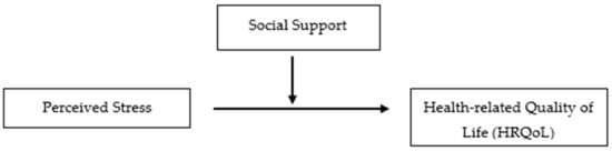 Moderation model of social support’s relation to perceived stress and health-related quality of life. The stress buffering model provides a conceptual framework for identifying a moderator of the association between stress and health-related quality of life. The independent variable is perceived stress. The dependent variable is HRQoL, measured by self-rated health, the number of poor physical and mental days, and activity limited due to poor physical/mental days. Social support is the hypothesized moderator that lies between stress and HRQoL. The stress buffering model would suggest that social support would buffer a presumed negative association between stress and HRQoL.