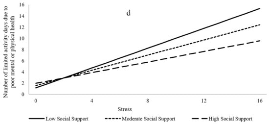 There was a significant interaction effect of social support and stress on the prediction of activity-limited days due to poor physical and mental health (B = −0.024; p = 0.033) (Table 3). Simple slopes analyses revealed that perceived stress was significantly related to activity-limited days at low, moderate, and high levels of social support (mean, ±1 SD; low = 24.19 (B = 0.89; p < 0.001), moderate = 32.91 (B = 0.68; p < 0.001), and high = 41.64 (B = 0.47; p = 0.002)) (Figure 2d). The Johnson–Neyman technique revealed that the significant point on the continuum of the social support (PSS; not mean centered) was 46.135, meaning perceived stress was significantly associated with activity-limited days due to poor physical or mental health, with social support scores ≤ 46.14 (94.55% of the sample).