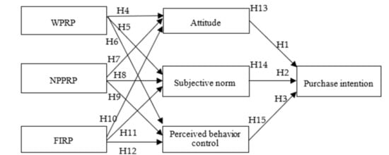 Liang and Huang found that online consumers’ attitudes and risk perceptions significantly affected consumers’ buying behavior [48]. Online consumers’ trust and risk perception toward online retailers affect their shopping attitude. Liebermann and Stashevsky found a negative correlation between risk perception and consumers’ use of e-commerce shopping [49]. Limayem et al. combined the perception of risk with the perceptions of effectiveness and convenience and analyzed the purchase intention of online consumers [50]. The research results show that convenience, effectiveness, and risk perception all significantly impact online consumers’ purchase intentions, where risk perception is the most significant factor. For this study, as is discussed above, we divided the risk perception of online bottled water into water pollution risk perception (WPRP), non-degradable packaging pollution risk perception (NPPRP), and false information risk perception (FIRP). These risk perceptions will weaken the planned behavior of consumers.