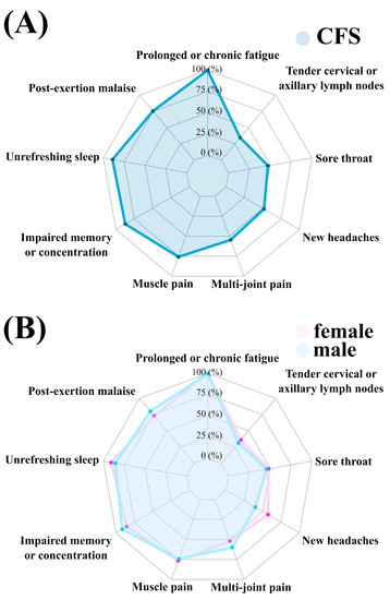 Spider chart on the prevalence of Fukuda symptoms in the whole sample (A) and in females and males (B).
