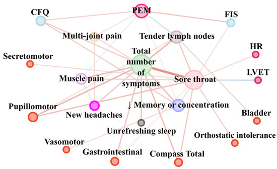 Network analysis of Fukuda symptoms’ coexistence with each other and fatigue scales, subjective and objective autonomic nervous system disturbance. Note: The variables were grouped according to categories illustrated by node colour. Each Fukuda criteria (post-exertional malaise (PEM) (hot pink), multi-joint pain (bisque), muscle pain (plum), new headaches (magenta), unrefreshing sleep (dark grey), ↓ memory or concentration (impaired memory or concentration (dark blue)), sore throat (pink), tender lymph nodes (auburn) and their total number (light green) are shown in the centre. Nodes indicating objective hemodynamic and autonomic parameters (HR—heart rate and LVET—left ventricular ejection time) are shown in cherry colour. Results of fatigue scales are shown in light blue (CFQ—Chronic Fatigue Scale, FIS—Fatigue Impact Scale). The total result of the Compass-31 scale (Compass Total), indicating subjective autonomic nervous system disturbances and divisions for components (secretomotor, pupillomotor, vasomotor, gastrointestinal, bladder, orthostatic intolerance), are denoted by bright red nodes. The size of the dots next to the variable names is continuously related to the number of statistically significant correlation coefficients with other variables. The colour of the edges denotes the trend of the correlation: blue indicates a negative correlation, while red indicates a positive correlation. Edge width and intensity of colour denote strength of relationship.