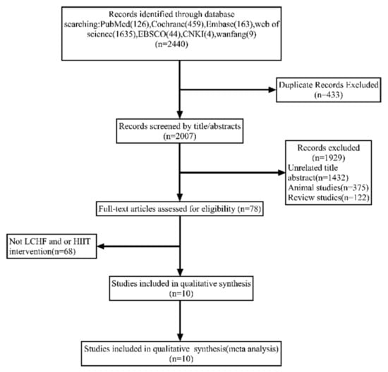 A total of 2440 articles were yielded through online libraries, and 433 duplicate articles were removed. After accessing the title and abstract, 1929 studies were excluded for the following reasons: unrelated title and abstract (1432), animal studies (375), and review studies (122). A total of 78 potentially related articles were screened by full text, while 68 articles were excluded owing to the absence of LCHF or/and HIIT interventions. Overall, 10 studies were included. The flow diagram of study selection is shown in Figure 1.