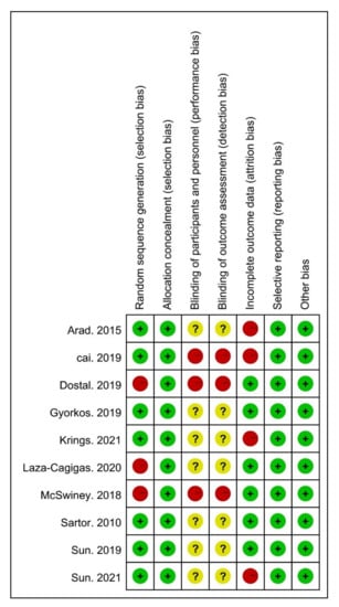 Risk of bias (ROB) was used to assess the risk of bias. The ROB of random sequence generation was “low” in seven and “high” in three studies. Regarding allocation concealment, the ROB was “low” in ten studies. For the blinding of the participants and personnel, the ROB was “high” in three, and “unclear” in seven studies. The ROB of blinding of the outcome assessments was “low” in six and “unclear” in four studies. For incomplete outcome data, the ROB was “low” in ten studies. Overall, all studies met the quality level. Therefore, no studies were excluded (Figure 2 and Figure 3).