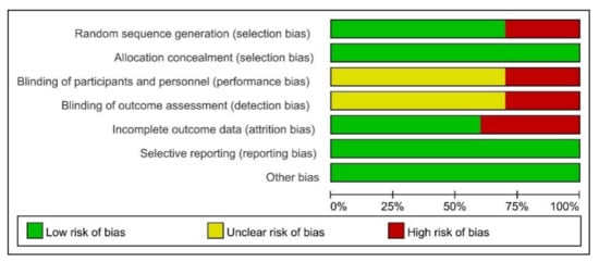 - Higgins, J.P.; Altman, D.G.; Gøtzsche, P.C.; Jüni, P.; Moher, D.; Oxman, A.D.; Savovic, J.; Schulz, K.F.; Weeks, L.; Sterne, J.A. The Cochrane Collaboration’s tool for assessing risk of bias in randomised trials. BMJ 2011, 343, d5928. [Google Scholar] [CrossRef] [Green Version]