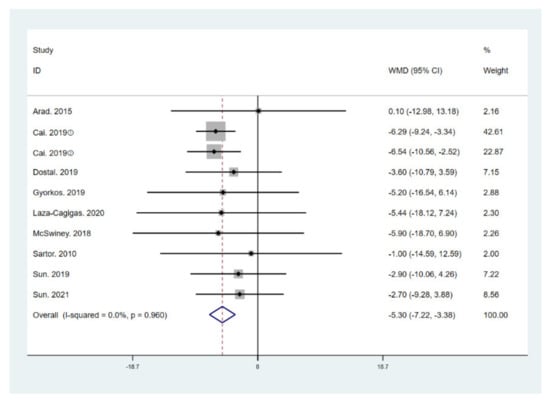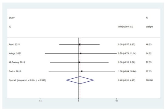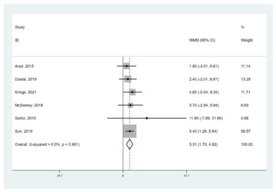 Meta-analysis was completed using stata15.0 (College Station, TX, USA). WMD was used as the effect size with a confidence interval value of 95%. Q test with I2 test was used to investigate whether there was heterogeneity among the studies, and a fixed-effects model was applied because p > 0.10 and I2 < 50% indicated better homogeneity between studies. To test for possible bias in the included studies, their funnel plot symmetry as well as the Begg’s rank correlation test were examined.