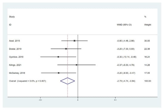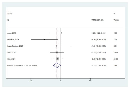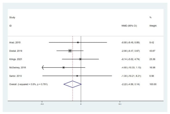 The results of meta-analysis indicate that participants that adhered to the LCHF diet and HIIT showed a significant reduction in BM (WMD = −5.299; 95% CI: −7.223, −3.376, p = 0.000, Figure 4), BMI (WMD = −1.150; 95% CI: −2.225, –0.075, p = 0.036, Figure 5), and BFP (WMD = −2.787; 95% CI: −4.738, −0.835, p = 0.005, Figure 6), and a significant increase in VO2max (WMD = 3.311; 95% CI: 1.705, 4.918, p = 0.000, Figure 7) as compared to the control group, while FM (WMD = −2.221; 95% CI: −4.582, 0.139, p = 0.065, Figure 8) and FFM (WMD = 0.487; 95% CI: −3.512, 4.469, p = 0.814, Figure 9) remained unchanged. No significant heterogeneity was detected in all indicators.