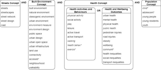 The research team identified three concepts that derived from the research questions to apply to the search: (i) Streets, (ii) Built Environment (BE), and (iii) Health. The Streets concept was chosen to ensure that we would capture studies that considered the BE as a measurable, human-scale environment (implementing the principle of pragmatism). The Health concept included two sub-concepts: health activities and behaviours, and health outcomes and wellbeing, to capture sufficient breadth of studies that relate to how the urban BE interacts with people’s life (implementing the principle of contestation). The team completed a brief scoping search of the academic and grey literature and identified key studies from each member’s respective fields, from which keywords were added, and appropriate medical subject headings (MeSH) were used to refine the terms used (implementing the principle of pluralism).