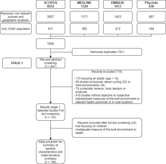 The heterogeneity inherent in the measurement of both health outcomes and BE features, including the apparent interchangeable use of objective and subjective measurements, means it is a significant challenge to isolate the key BE features that are linked to children’s health []. Even when there is wide recognition of the significance of certain BE attributes, such as street connectivity in promoting health activities, the evidence remains ambiguous [,]. This in turn means that there is limited evidence to guide urban planning and policy decisions to shape healthy environments []. The aim of this review was to contribute to addressing this challenge by conducting a meta-narrative analysis of the associations of BE attributes and health outcomes measured in studies of child health, focusing on studies that considered objective (e.g., number of intersections within a set walking distance from home) or standardised subjective measures (e.g., a standardised street perception survey) of the BE.