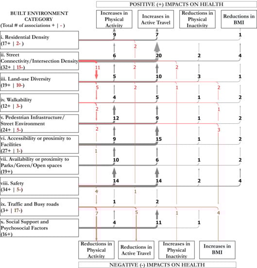 As noted in previous reviews, we found that the operational definition for the built environment (BE) variables in the reviewed studies presented a low degree of conformity []. Likewise, the definition of health and activity outcomes varied widely. However, when assessing the interaction between the BE and children’s health, the summary of associations enabled us to identify broad categories of BE attributes that are likely to be protective factors supporting health activities and outcomes such as physical activity, play and active travel, and BMI in children and adolescents. Table 3 and Table 4 in the previous section list the ten broad categories of BE attributes and their association with the studied outcomes. The ten categories include measurements relative to: (i) residential or population density; (ii) intersection density (or other measures of street connectivity); (iii) land-use diversity; (iv) walkability (a composite measurement including the previous three attributes); (v) street-level walking infrastructure and perceptions of street environments; (vi) accessibility or proximity to recreation, sports, or play spaces or facilities, and proximity to school as a the key determinant for active travel to school; (vii) availability and accessibility to public open and social spaces and natural environments such as parks, green spaces, street greenery, and water bodies; (viii) perceptions of safety from traffic and crime; (ix) motorised traffic levels and the presence of main roads; and (x) social support and psychosocial factors.