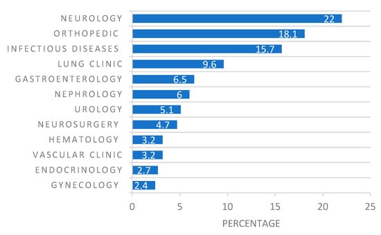 A total of 870 inpatient falls were reported among the twelve clinics. We cannot compare or interpret this total as being high or low since there is no cut-off point available in the literature for the total number of falls in a hospital setting. The only reference point that is available is that inpatient falls generally happen 2.3 to 7 times per 1000 patient days [], but the gathered data from this study did not allow for the calculation of patient days. The neurology and orthopedic clinic had the largest amounts of inpatient falls, constituting the 40% of the total amount of inpatient falls within the organization. These findings were expected since patients in such clinics usually have functional limitations and activity restrictions that constitute significant intrinsic factors for a fall [,,]. The findings are in line with previous studies regarding the epidemiology of inpatient falls [,].