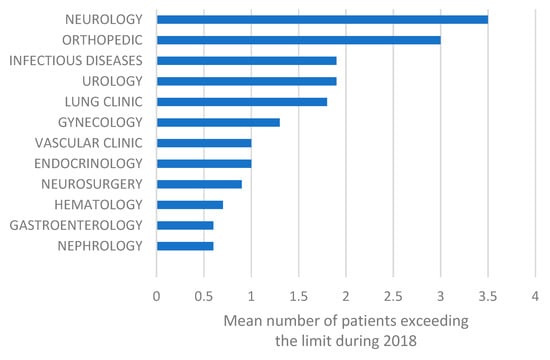 Eight out of the twelve examined clinics were identified as overcrowded during 2018. The neurology and orthopedic clinics were the most overcrowded places, with values of 3.5 and 3, respectively, representing the mean number of patients exceeding the maximum capacity each month. The fact that 75% of the clinics within the organization were overcrowded by inpatients further highlights the previously reported low number of hospital beds per hundred thousand inhabitants in Sweden []. While these statistical speculations exclusively concern the examined hospital organization and, in no cases, reveal a causation between inpatient falls and overcrowding, they lay the foundations for further in-depth scientific investigation on the subject, which is urgently needed []. The malicious effects of overcrowding in the clinics have been observed in a plethora of studies, from both the patients’ and medical personnel’s perspectives []. Since overcrowdedness of clinics is proven to cause burnout and dissatisfaction in medical personnel [], negative outcomes and discomfort in patients, and a reduction in their safety during hospitalization [], inpatient falls could occur more frequently. Additionally, it was previously reported that adverse events, such as falls, are more likely to happen during periods of increased bed occupancy, although empirical data in this field are rare in the literature []. Teitelbaum et al., in their unique study concerning patient overcrowding and inpatient falls, suggested that patient overcrowding in a hospital setting should be added to the other extrinsic risk factors for inpatient falls [].