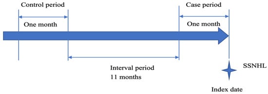 A case-crossover design was adopted to elucidate the relationship between acute URIs and SSNHL. The case-crossover design is a well-established method to evaluate whether exposure to acute URIs was intermittent, whether the effect of exposure was immediate, and whether the outcome was abrupt [18,19]. In this study, we used a 1-month period as the exposure time window, with the 1st to the 30th day before the index date defined as the case period. To reduce the risk of confounding by seasonal fluctuations, we chose 1 year before the index date as the control period for the same individuals (Figure 1). Because the control period was specific for each patient, time-invariant between-person confounding factors, such as genetic vulnerability or chronic medical conditions, were automatically controlled.