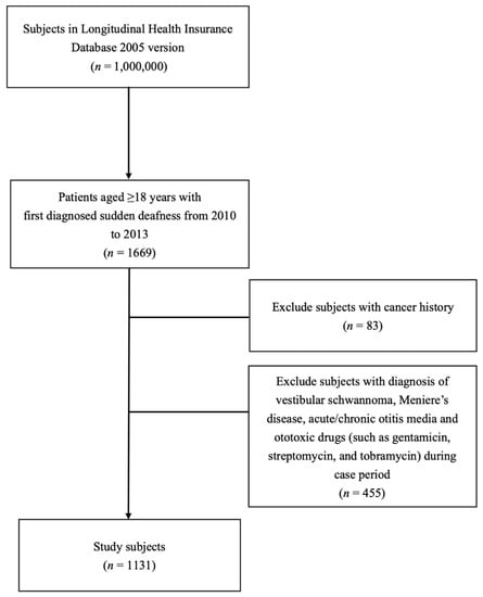 Patients in the LHID 2005 who received their first diagnosis of SSNHL (International Classification of Diseases, Ninth Revision, Clinical Modification [ICD-9-CM] code 388.2) between 2010 and 2013 were identified as study participants. SSNHL diagnosis was defined as SSNHL as the main diagnosis at discharge or an SSNHL diagnosis (ICD-9-CM code 388.2) confirmed at least twice in outpatient visits. To ensure diagnostic validity, only patients who were diagnosed with SSNHL by otorhinolaryngologists repeatedly during two consecutive outpatient visits were included [16,17]. We excluded patients with a diagnoses of vestibular schwannoma (ICD-9-CM code 388.5, 225.1), Meniere disease (ICD-9-CM code 386.XX), acute or chronic otitis media (ICD-9-CM code 381.XX, 382.XX), malignant disease, and using ototoxic drugs (such as gentamicin, streptomycin, and tobramycin) (ATC code J01GB03, J01GA, J01GB01) during case period. The date of the first diagnosis of SSNHL was defined as the index date.