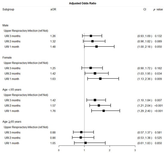 Forest plots of adjusted odds ratios for SSNHL comparing the different exposure time windows for acute URI and control groups by sex and age. (Adjusted covariates of ototoxic drugs, cholesterol-lowing drugs, and anti-platelet drugs listed in Table 1; Abbreviations: SSNHL, sudden sensorineural hearing loss; URI, upper respiratory tract infection; aOR, adjusted odds ratio; CI, confidence interval; ref., reference group; y, years old).