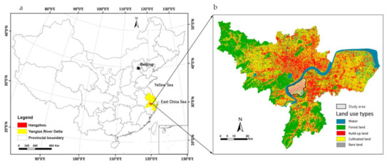 Hangzhou City is located south of the Yangtze River Delta in China and west of the East China Sea. The latitude and longitude boundary of the city area is 29°11’ to 30°34’ north; 118°20’ to 120°44’ east. The eastern part of the city situated in the North Zhejiang Plain (which forms the Hangjiahu Plain and the Ningshao Plain). The terrain is low and flat, with an elevation of only 3–6 m; There are also dense river networks and lakes. In terms of the city’s land mass, mountains and hills account for 65.6%, plains account for 26.4%, and various water bodies account for 8%. The study area, which is characterized by built-up land, cultivated, and small-scale forest land with densely distributed stream networks, is to the south of the Qiantang River (Figure 1). During the past decade, it has experienced intense urbanization as a large-scale land-use transformation has taken place, meaning croplands and wetlands have been changed into built-up areas.