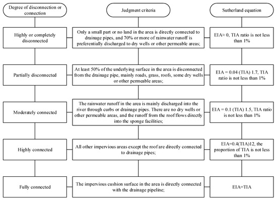 To determine the influence of land-use on surface runoff and runoff water quality, the scope of the research should first be determined. In accordance with the development trend of watershed systems, the water-quality grade of an area’s runoff and the first-level runoff are selected for watershed division [42,43]. Hangzhou City is a plain river-network city, and the drainage network of different land types are directly connected with the river, so each plot includes a separate watershed. Here, the value of land-use zoning in different regions are obtained with the Sutherland classical equation; the Sutherland classical equation can calculate the site effective impervious area rate, which is connected to the issue of small watersheds (8–28 hectares) according to the Chinese Geological Survey (the specific method is shown in Figure 3). The sample points for transformation are determined based on the construction drawings of water absorption facilities at each point, and then they are combined with what needs to change in line with the classification criteria in Figure 3 [44,45]. The anti-seepage area of residential and multi-person buildings was partially disconnected from the drainage collection system, the anti-seepage area of the park was largely disconnected from the drainage collection system. Lastly, the anti-seepage area in each block was connected to the drainage collection system.