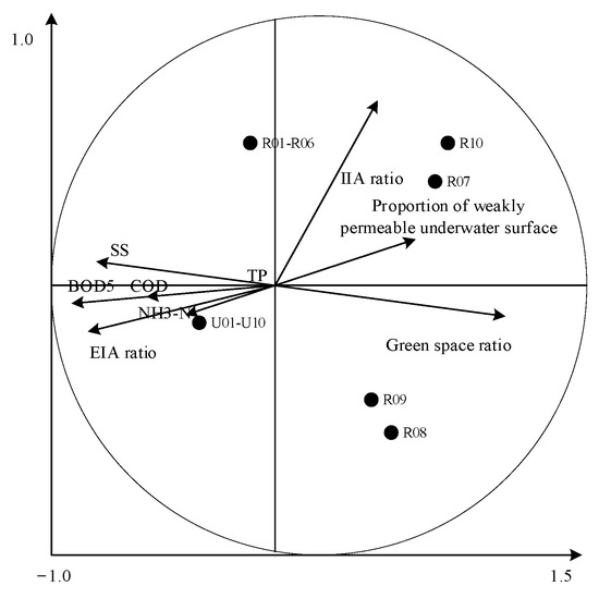 Figure 4 shows the fact that the types of land-use indexes that are affecting the runoff water quality of each sample are significantly different. The reconstructed public building samples (R01–R06) are mainly affected by the IIA ratio. Park samples (R08 and R09) and park samples (R07 and R10) are significantly affected by the green space ratio and IIA ratio. Unmodified samples (U01–U10) are generally affected by the green space rate and EIA of impervious surfaces. The EIA of construction land is the main index of increased runoff pollution load. Meanwhile, the green space rate, the artificial permeable surface rate, and the IIA are negatively correlated with the water quality index [49]. The correlation between the green space rate and water quality index is the greatest, indicating that the degree of interception of green space on runoff pollution load is higher than the other two indexes. Land use had significant effects on SS, BOD, COD, and NH3-N, while TP had no significant effect on land use. The correlation between the EIA ratio and water quality, and between the IIA ratio and water quality indexes, are compared. The results show that the EIA ratio and IIA ratio have oppositional impacts on water quality indexes, and the correlation between EIA and water quality indexes is higher than that found with regard to the IIA.