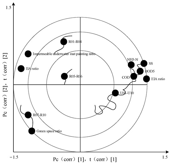 Figure 5 illustrates that the updated plots are mainly affected by the ratio of green space, IIA, and artificial permeable surface. R01–R04 is mainly affected by the proportion of IIA in impervious surfaces, R07–R09 is mainly affected by the proportion of green space. The representative water quality indexes are SS, BOD5, COD, and NH3-N, which are influenced by the effective impervious area.