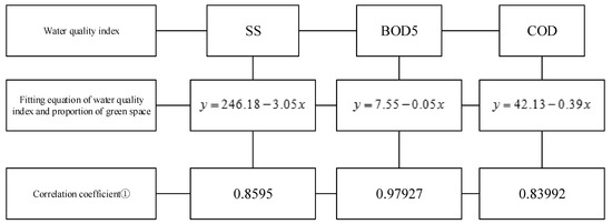 Fitting equation of runoff water quality. Note: ① the closer the correlation coefficient is to 1, the closer the fitting result is to the data to be fitted, and the better the fitting result is. Besides, When EIA ≈ 0, the regression predictions for suspended solids (SS), biochemical oxygen demand (BOD5), chemical oxygen demand (COD), and the proportion of green space.