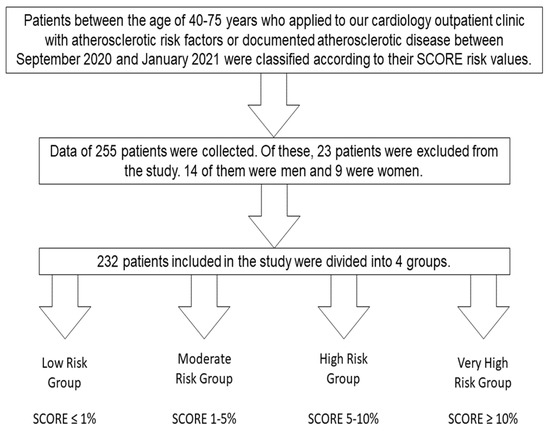 | Parameters | Reference Range | Low Risk Group SCORE ≤ 1% N = 53 | Moderate Risk Group SCORE 1–5% N = 63 | High Risk Group SCORE 5–10% N = 46 | Very High Risk Group SCORE ≥ 10% N = 70 | p-Value |