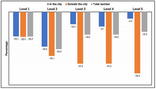 The total utilization of medical care decreased from 2018 to 2020 at all care levels. The proportion of comprehensiveness was higher in 2020 than 2018 at all care levels. At care levels 3, 4, and 5, the differences between proportions in 2018 and 2020 were statistically significant (p = 0.020, 0.015, and 0.002, respectively) (Table 2). The medical care received in Unnan City has been reduced from −5.5% in 2018 to −28.5% in 2020. Meanwhile, the medical care received outside the city declined from −20.4% in 2018 to −50.4% in 2020. Overall, the proportions of utilization of medical care decreased during 2018–2020, from −15.1% to −30.5% (Figure 1).